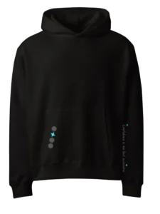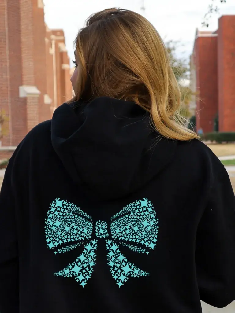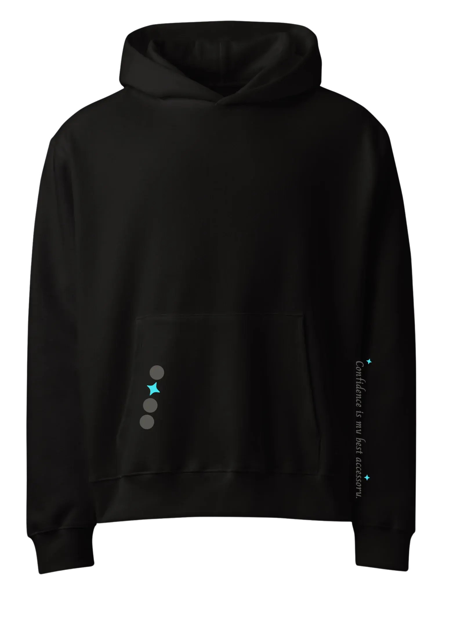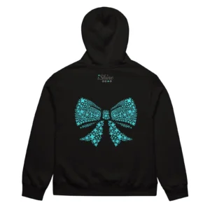 This Black Hoodie with Aqua Bow style is intended to remind you that meaningful beauty is rooted in your character, your authenticity, and your self-confidence. It features the affirmation, Confidence is my best accessory,’ complemented by iShine’s bow mosaic graphic on the back.