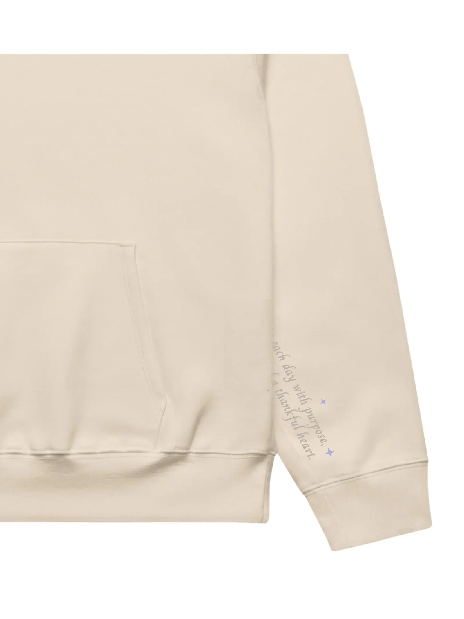 This Simplicity Dust Hoodie style honors how the transformative power of mindful intention, positivity, and gratitude can shape each day and your outlook on life. It features the affirmation, ‘Begin each day with purpose, positivity, and a thankful heart.’.